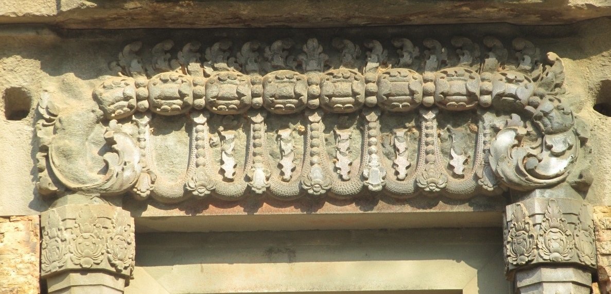 នៅមុខខាងកើត គេរៀបក្បាលជណ្តើរអមសងខាងខឿនយ៉ាងខ្ពស់ភ្ជាប់ដោយបដិមាតោមួយគូ កាំជណ្តើរ ៧កាំ ទ្រនាប់ជណ្តើរ ១។ ចម្លាក់តោនៅទីនេះមានចំនួនសរុប ៦ ពោល គឺគេដាក់នៅមុខទ្វារចូលទិសខាងកើត មុខទ្វារបញ្ឆោតទិសខាងជើង និងមុខទ្វារបញ្ឆោតទិសខាងត្បូង ប៉ុន្តែនៅខាងលិចពុំមាននោះឡើយ។ បដិមាតោចំនួន ៣ គេយកទៅរក្សាទុកនៅសារមន្ទីរខេត្ត តែបដិមាតោ១បាត់បង់បាត់ទៅហើយ។ អ្នកស្រាវជ្រាវប្រវត្តិសិល្បៈដ៏ល្បីល្បាញមួយរូប គឺលោក Jean Boisselier យល់ថា បដិមាតោនេះអាចសង់ឡើងពេលវេលាខុសគ្នាជាមួយប្រាសាទ (សាងក្រោយប្រាសាទ)[4]។ ចំណែកឯលោក Phillipe Stern យល់ថា បដិមាតោនេះមានលក្ខណៈស្រដៀងតោនៅប្រាសាទថ្មដាប់ លើភ្នំគូលែន ហើយស្ថិតនៅក្នុងរចនាបថគូលែន ចុងស.វ.ទី៨[5]។ ចម្លាក់តោទាំងអស់ មានមាត់បើកធំ ធ្មេញសំប៉ែតធំ ភ្នែកបើកសំឡឹងមើលទៅមុខ រោមរួញសំពោងធំជាងដងខ្លួន កន្ទុយដាក់សន្ធឹងរហូតដល់ក្បាល ជើងទាំងបួននៅនឹងថ្កល់ឥតចលនា ក្បាល និងដងខ្លូនមិនសមាមាត្រគ្នាទេ គឺក្បាលធំជាងដងខ្លួន តែសិល្បករឆ្លាក់យ៉ាងផ្ចិតផ្ចង់[6] (រូបលេខ៤)។