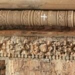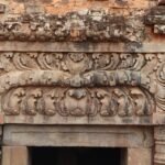 ប្រាសាទនេះមានទ្វារចូលនៅខាងកើត និងពុំមានលម្អជាទ្វារបញ្ឆោតដូចប្រាសាទដទៃទៀតក្នុងរចនាបថមុនៗឡើយ ប៉ុន្តែគេលម្អជាជញ្ជាំងលាតទ្រដោយខឿនរាងជាសារពើសូត្រ។ នៅលើផ្ទៃជញ្ជាំងនីមួយៗគេរៀបជាក្បាច់រុក្ខជាតិត្រួតលើគ្នាយ៉ាងប្រណិតបំផុត។ ផ្តែរទ្វារវិញ នៅរក្សាទម្រង់ស្ទើរតែដូចដើម ដែលលម្អទៅដោយក្បាច់បន្ទាត់ធ្នូមានរាងដូចមែកឈើ ខាងចុងផ្តែរមានគួចទៅលើចូលក្នុងដូចគូទខ្យង នៅកណ្តាលជាក្បាច់សន្លឹកមានរូបកិត៌ិមុខ (ប្រែថា៖ មុខដែលមានយស មានសិរីសួស្តី មានកេរ្តិ៍ ហើយខ្មែរយើងនិយមហៅថា “រាហូ”) ឬអាចជាព្រះកាល (ជាការបែងភាគរបស់ព្រះសិវជាតួអង្គដែលមានទឹកមុខកាចសាហាវ ហើយគេច្រើនយល់ថាជានិម្មិតរូបនៃសេចក្តីស្លាប់និងការកើតឡើងវិញ)[3] (រូបលេខ៣)។ ការលម្អរូបកិត៌ិមុខឬព្រះកាលនៅកណ្តាលផ្តែររបៀបនេះ មានភាពនិយមខ្លាំងណាស់នៅក្នុងរចនាបថកំពង់ព្រះ ដូចឃើញមាននៅប្រាសាទព្រៃក្មេង ផ្តែរមួយមកពីតំបន់សំបូរ-ក្រចេះ និងប្រាសាទភ្នំស្រួច។ ក្រៅអំពីផ្តែរដែលនៅរូបរាងល្អ សសរពេជ្រ និងសសរផ្អោបនៅប្រាសាទភូមិប្រាសាទ ក៏នៅតែរក្សារូបរាងល្អប្រសើរដូចគ្នា (រូបលេខ៤)។